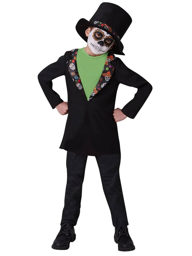 Show off his deadly debonair looks with style in this Day of the Dead Costume which features a jacket attached shirt insert, rose accents and top hat.