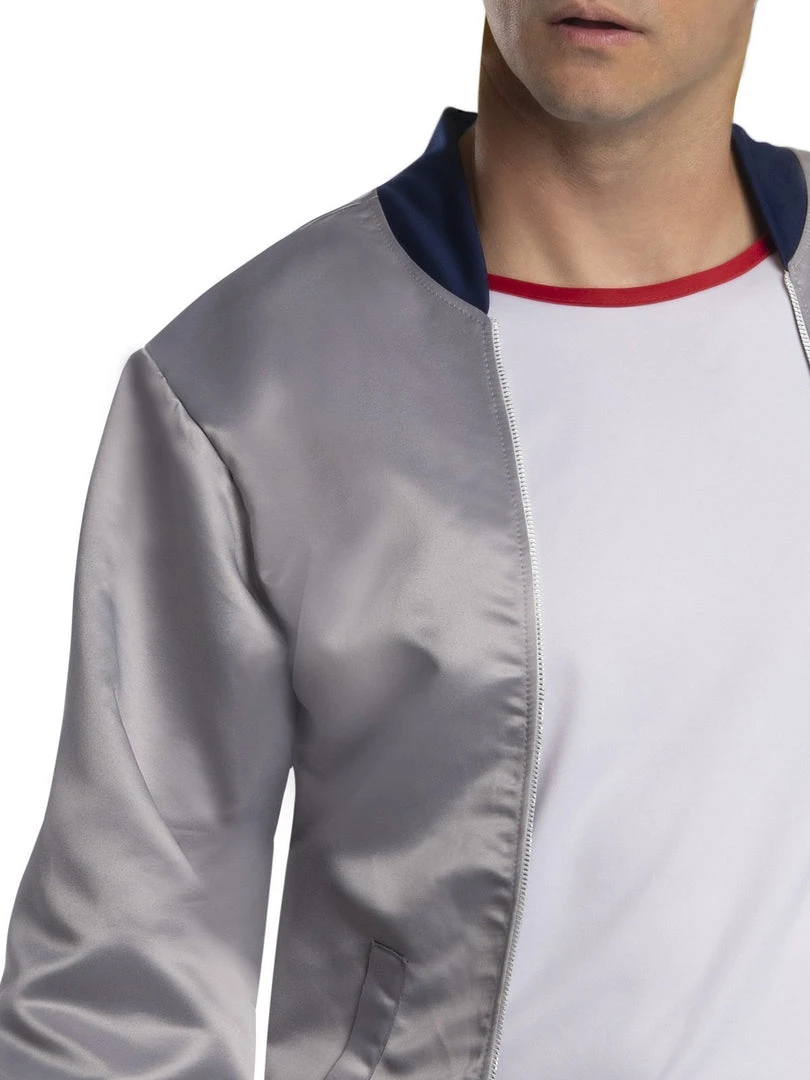 - Silver Satin jacket with contrasting collar, wrist and waist band plus front false zipper and faux pockets
