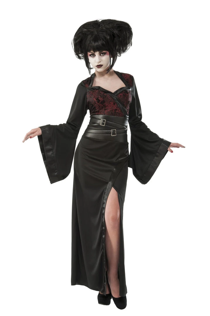 - Polyester long black dress with high slit at leg and ornate trumpet sleeves