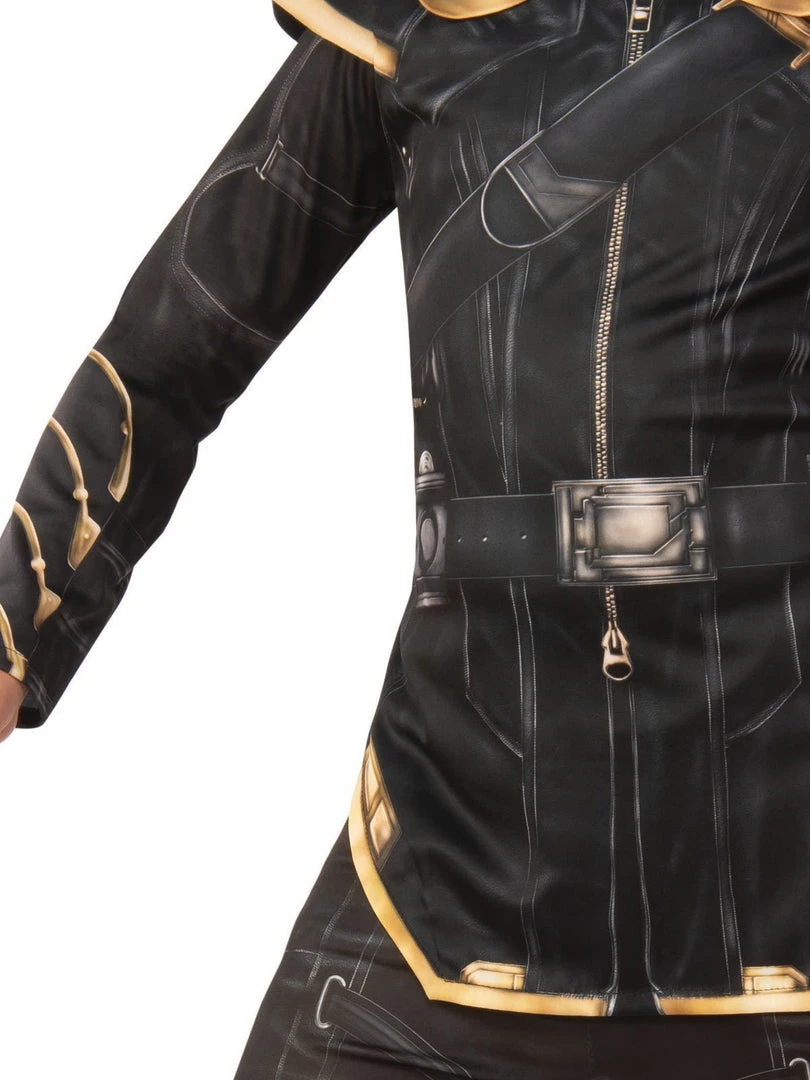 - Jumpsuit with digital printed bodice, foam padded armour, upright collar and attached harness