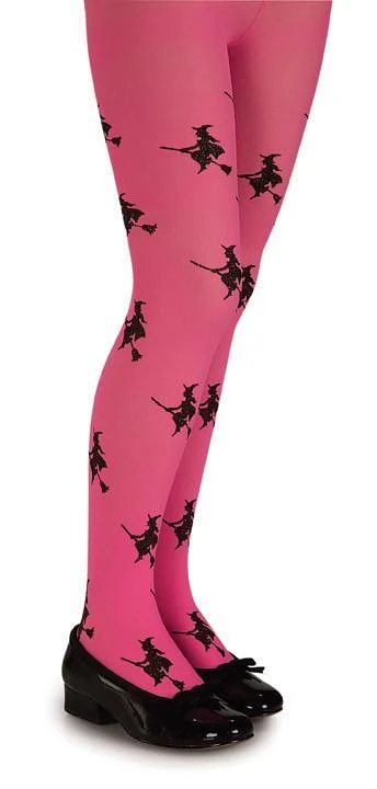 - Glittery pink full-length tights with printed witches riding on a broom stick in black print