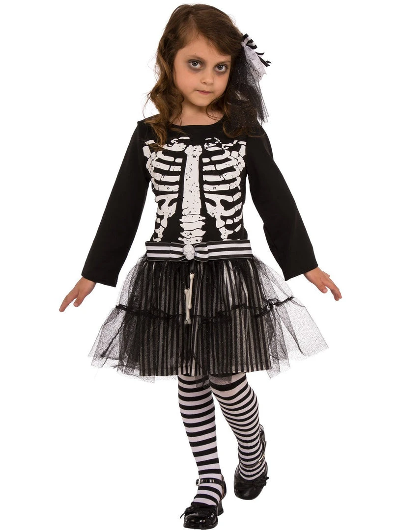 - Dress with attached layered tutu skirt and featuring skeleton print on bodice